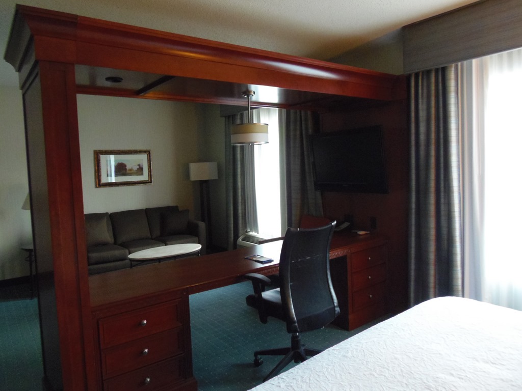 My room was a 1 King Bed Suite. The room was very comfortable and clean on entering. Got myself comfortable for the evening. The room had a large desk splitting the area into two sections. A television was attached to the desk, viewable from either side of the desk