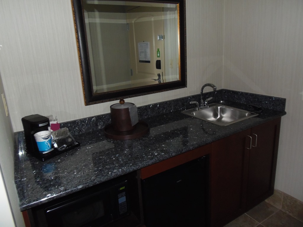 The bathroom had nice, clean and fresh towels, a collection of toiletries and a hair dryer. There was also a little nook with a good-sized counter with a small sink, a coffee maker and a collection of coffees and teas, a microwave and a mini fridge rounded out the area.